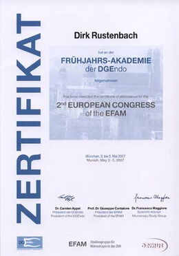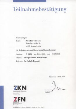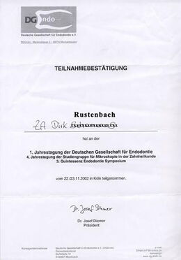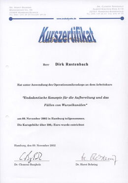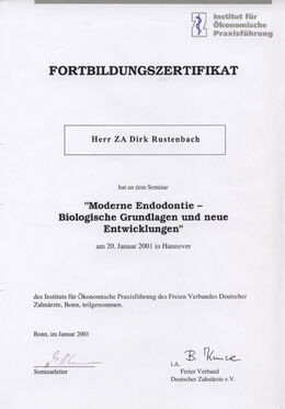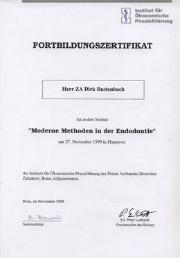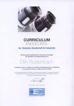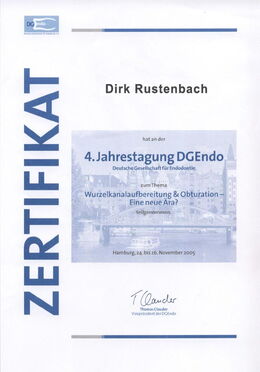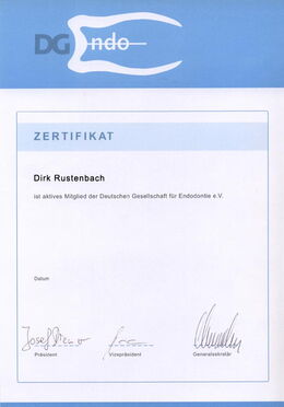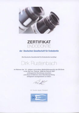 - Zertifizierter Endodontologe durch die DG-Endo (Deutsche Gesellschaft für Endodontie e. V.) durch strukturierte Fortbildung, Patientenfalldokumentation und Abschlussprüfung seit Februar 2007