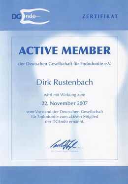 - Aktive Mitgliedschaft in der Deutschen Gesellschaft für Endodontie seit 22. November 2007 (www.dg-endo.de)