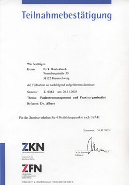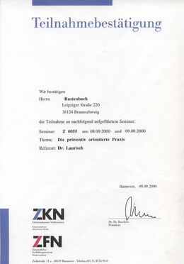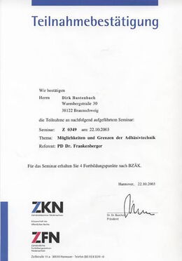 - Hospitation im Rahmen der strukturierten Fortbildung Implantologie der Zahnärztekammer Niedersachsen in der Abteilung für Zahn-/Mund- und Kieferchirurgie der Medizinischen Hochschule Hannover, Betreuer: OA PD Dr. Dr. Rupert Dempf, 14.03.2005