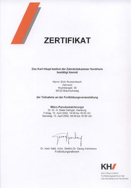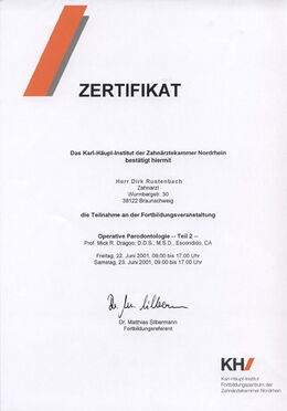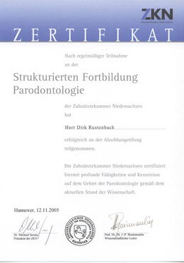 - Zertifizierter Parodontologe durch die Zahnärztekammer Niedersachsen seit 12.11.2005 durch zweijährige, strukturierte Fortbildung und Patientenfalldokumentation (www.dgparo.de)