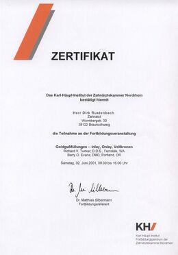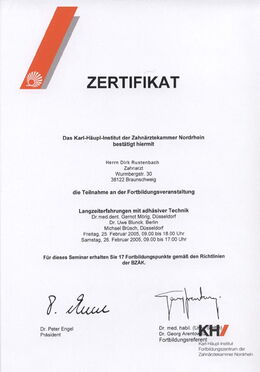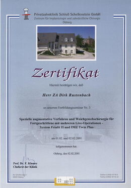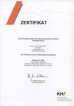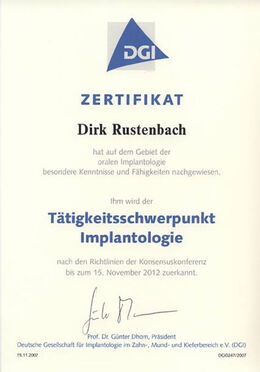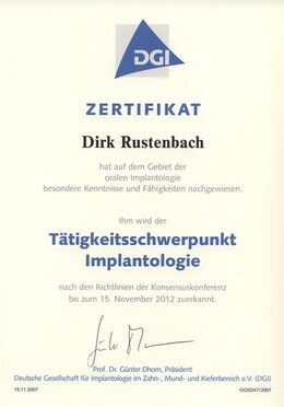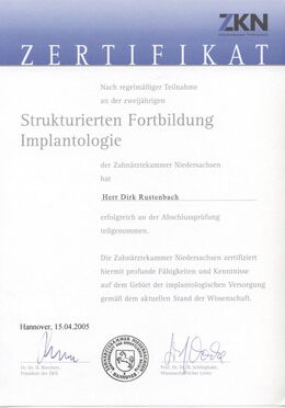 - Zertifizierter Implantologe durch die Zahnärztekammer Niedersachsen seit 15.04.2005 durch zweijährige, strukturierte Fortbildung und Patientenfalldokumentation (www.dgi-ev.de)