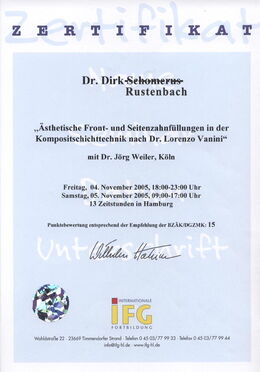 - Ästhetische Front- und Seitenzahnfüllungen in der Kompositschichttechnik nach Dr. Lorenzo Vanini, Referent: Dr. Jörg Weiler, 04./05.11.2005, Köln