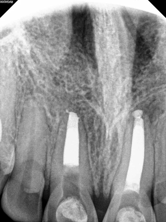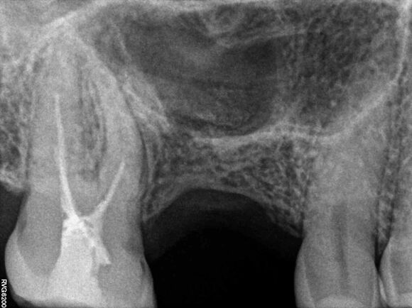 Schwierige Situation nach einen Unfall bei einem Kind - Wurzelwachstum noch nicht abgeschlossen - Füllung mit MTA - ausgedehnte Entzündung und Beschwerden.